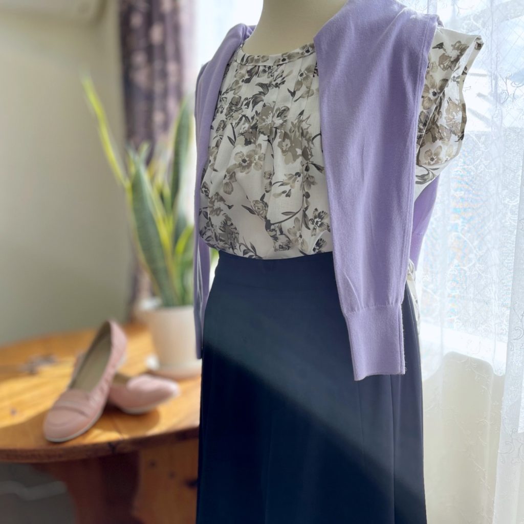 ネイビーの揺れるワイドパンツに、ユニクロのUVカットクルーネックカーディガン。色は私のベストカラーのひとつラベンダーです。顔写りも第一印象もよりよく見えます。
