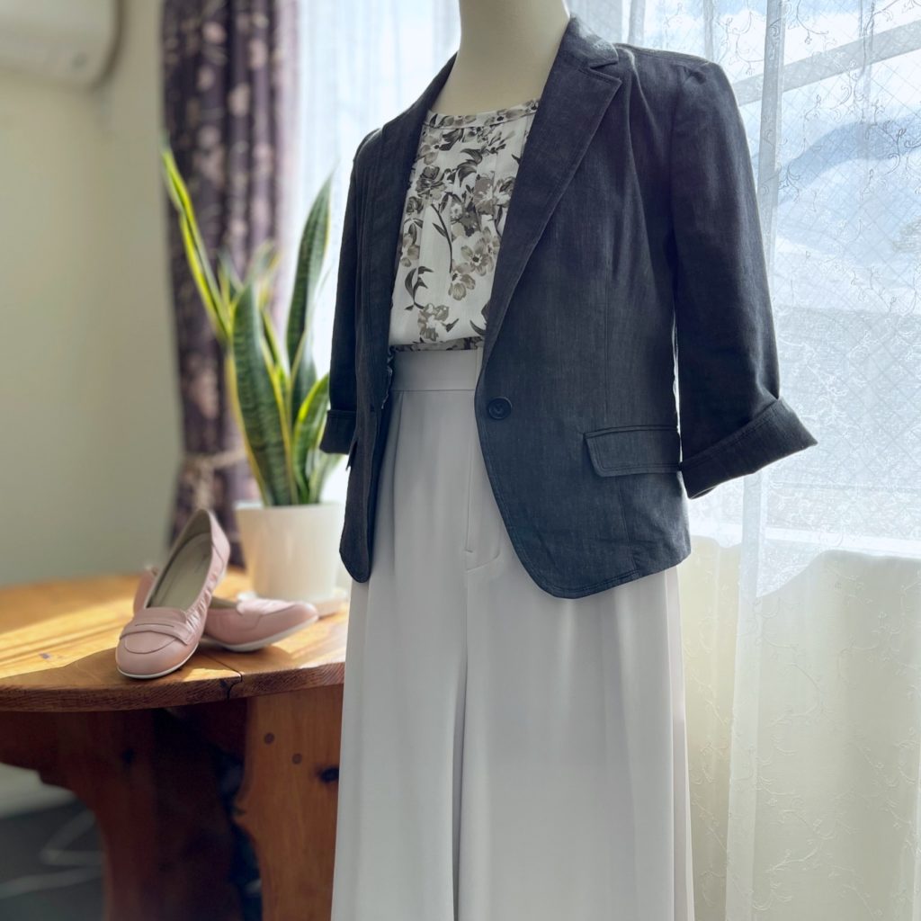 ダークグレイと白のジャケットに合わせました。初夏から活躍する組み合わせです。