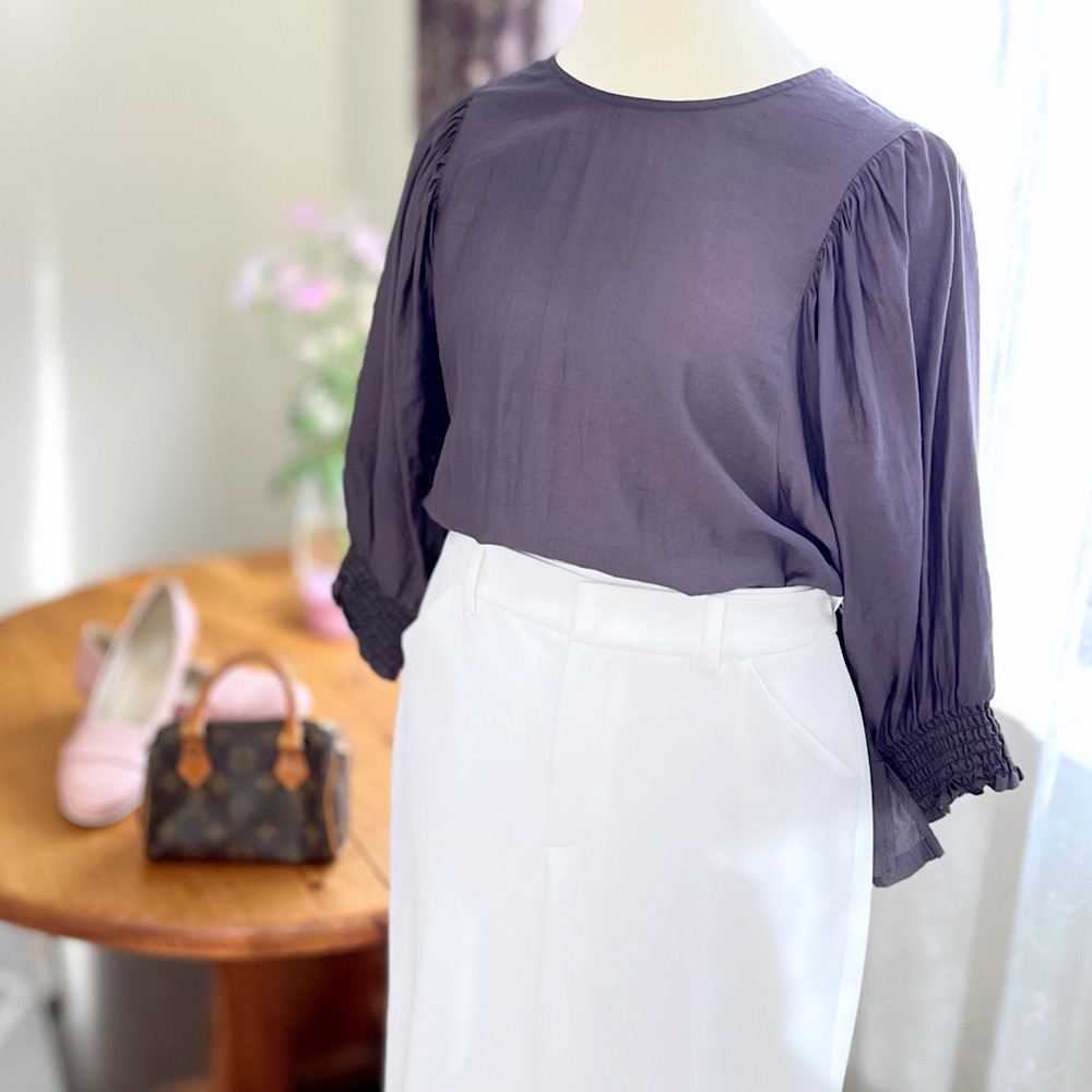 空きすぎない襟ぐりにフンワリ袖がお気に入り。