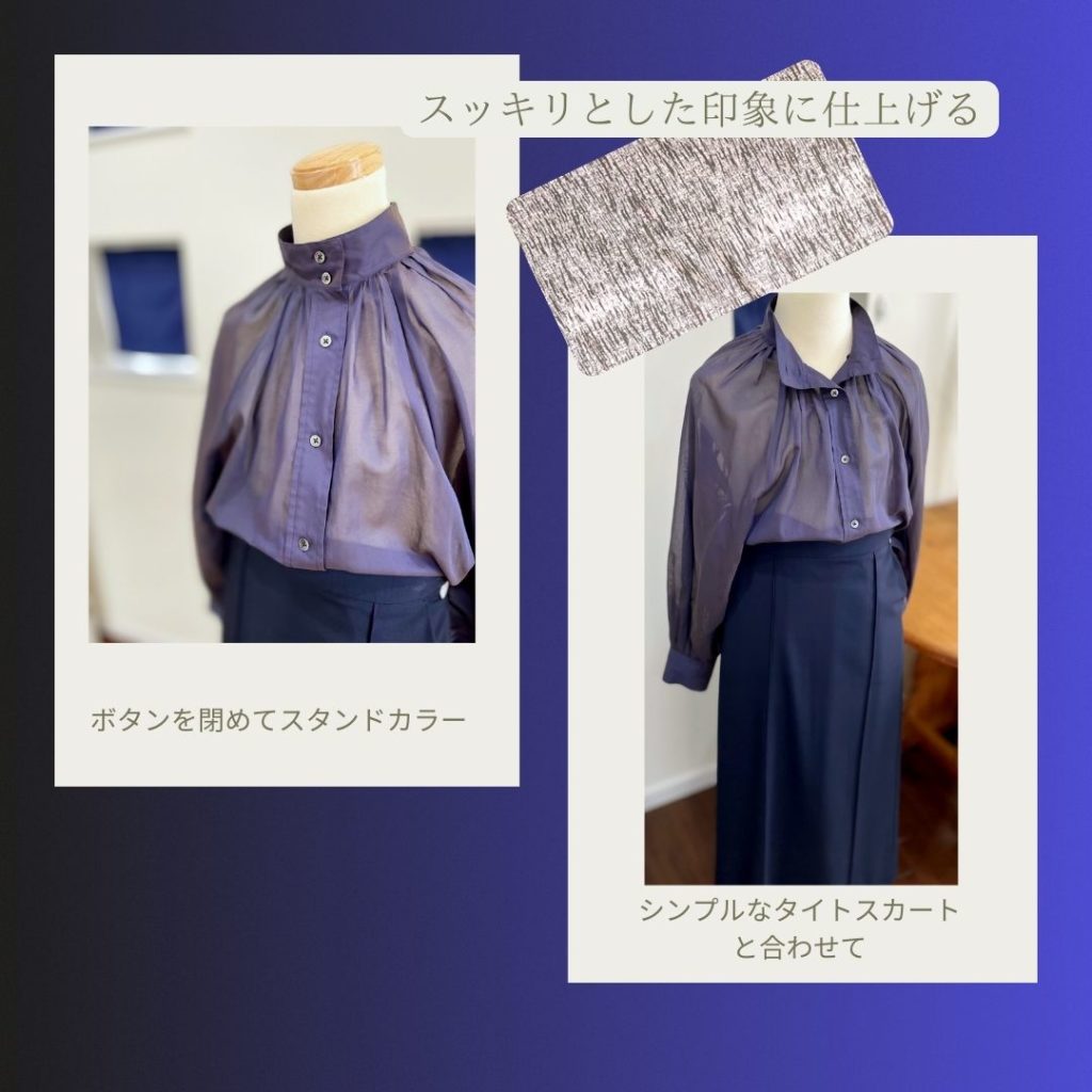 シアー素材のトップスは襟のデザインがカッコいいので購入を躊躇いましたが、これぞ私っぽい!ではなかったけれど生地の厚みや柔らかさは私にピッタリでしたので、コーディネイトのイメージを合わせればきっと素敵に着こなせる!と、逆に即決でした。